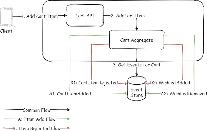 As shown in the diagram above, cart aggregate would accept the command and then load the current state before deciding the next action. The next actions would be stored as events in the database. Again, this whole process will be within a single transaction scope.