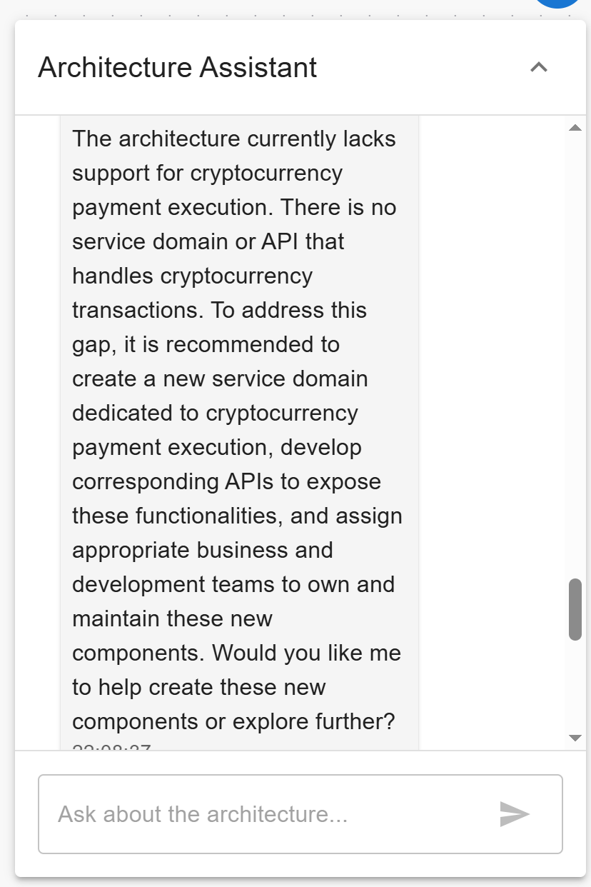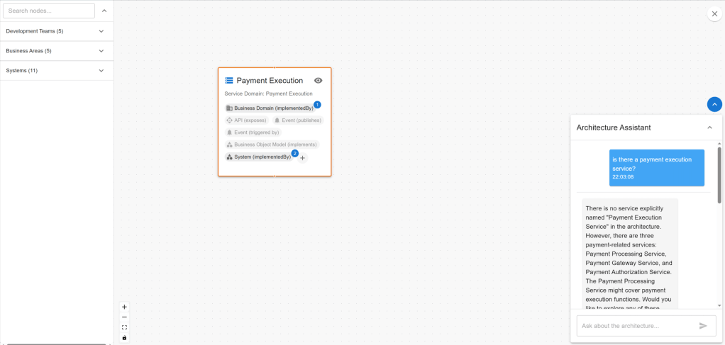 - Use an AI-powered agent to answer natural language queries about the architecture, such as finding specific nodes, understanding relationships, identifying team responsibilities, or performing gap analysis (e.g., checking for missing features like crypto currency support)